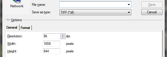 Next I selected File > Export Map and set it to TIFF and changed the Resolution setting to 96 DPI. This gave me the size of the image in pixels that I am currently viewing in ArcMap, in my case 1659 x 844.