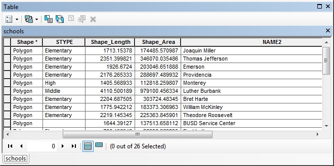 Open the feature class in ArcMap and bring up the attribute table.  Below is a feature class representing schools.
