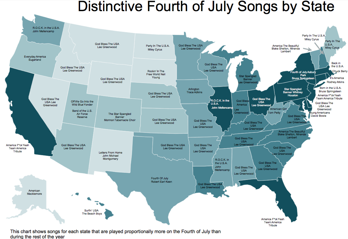 Happy Fourth Of July! Posted on July 4, 2019 by socalgovgis - Michael Carson This map shows the most popular “Fourth Of July” songs in each State. Found in this article. And how much do we all spend on fireworks? Found in this article. Share this: Click to share on X (Opens in new window) X Click to share on Facebook (Opens in new window) Facebook Click to share on Tumblr (Opens in new window) Tumblr Click to share on LinkedIn (Opens in new window) LinkedIn Click to email a link to a friend (Opens in new window) Email Click to print (Opens in new window) Print Like Loading... Related