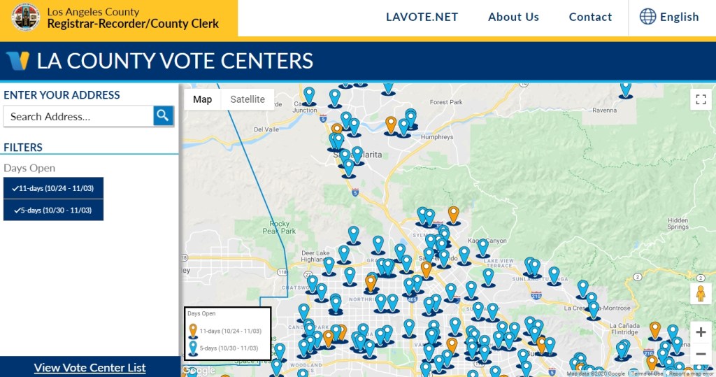 Looking for a voting center in LA County to vote in person? Check out their interactive map of voting centers. Some centers will be open as early as October 24th!
