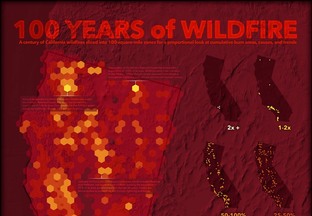 Here is an interesting ESRI article about using ArcGIS Pro geoprocessing to create aggregated fire cells of fire data, symbolizing the data, and using ArcGIS Maps for Adobe Creative Cloud to finish the cartography for a 100 Years of Wildfire map. Some great techniques show here. Check it out!